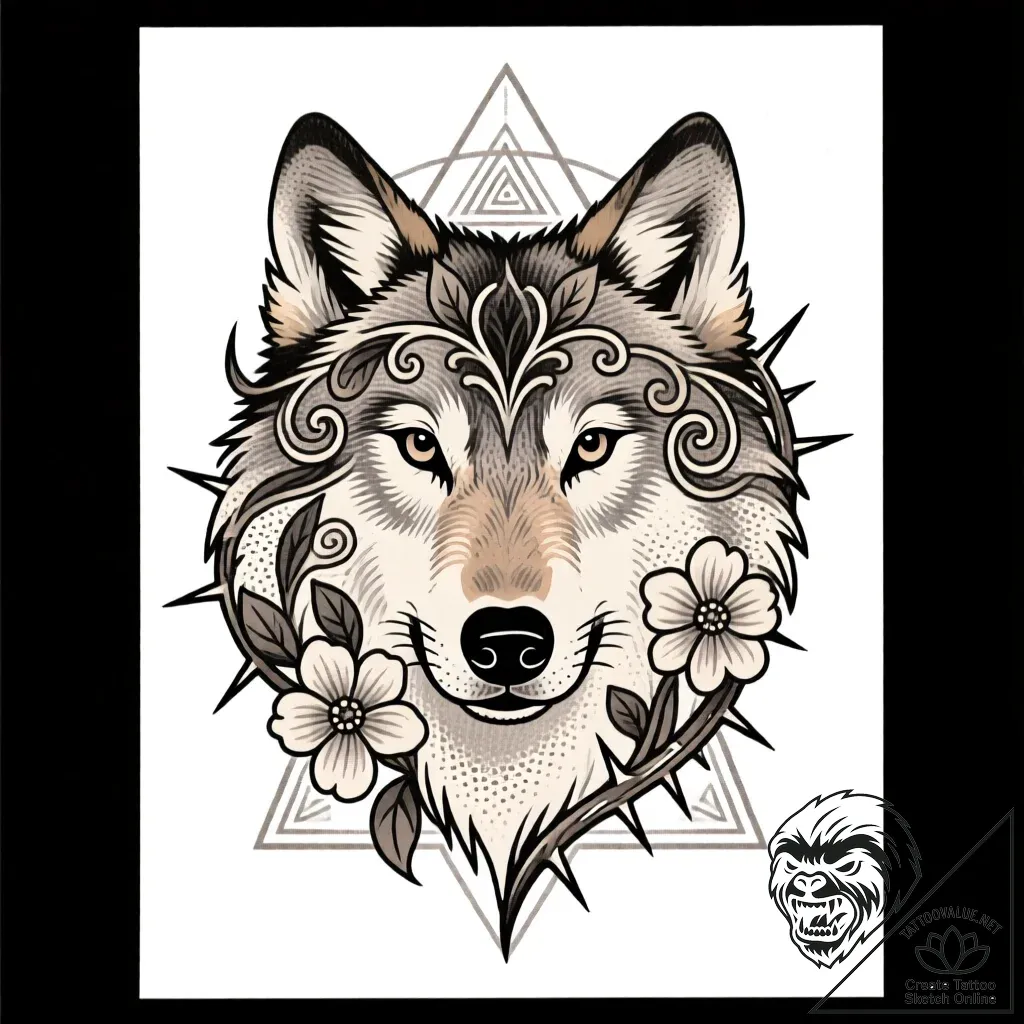 - Original User Request (RU): tattoo sketch, wolf face composed of swirling floral patterns and thorns, fierce beauty tattoo, tattoo flash sheet design, muted color palette, desaturated colors, vintage tattoo feel, soft whip shading, pepper shading, smooth dot shading, on a clean white paper, isolated, geometric tattoo style, sacred geometry patterns, mandalas, abstract shapes, symmetrical