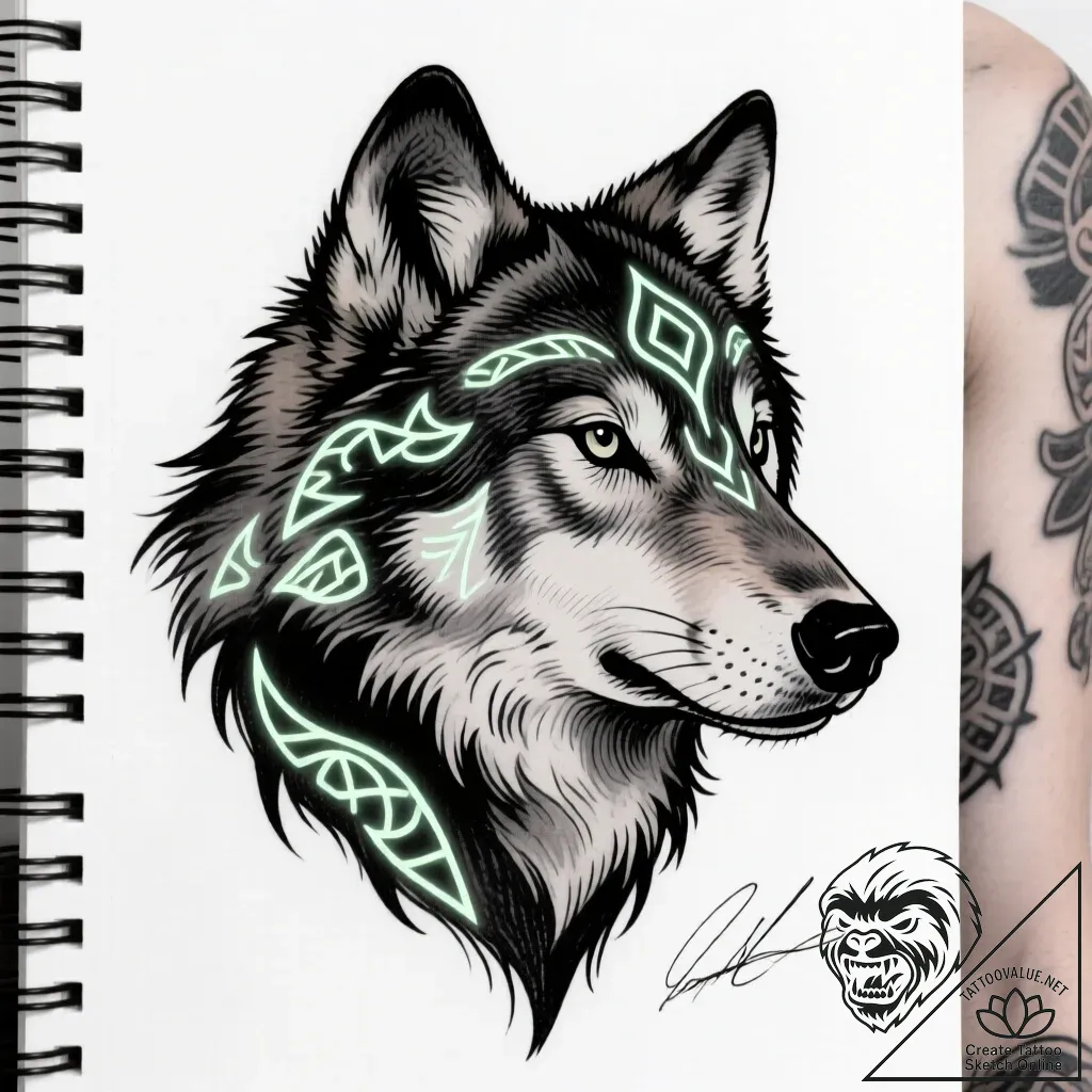 This striking wolf sketch is a masterful blend of realism and mystique, with its photorealistic detail and delicate linework evoking a spirit guide's whisper. The glowing tribal markings adorning its