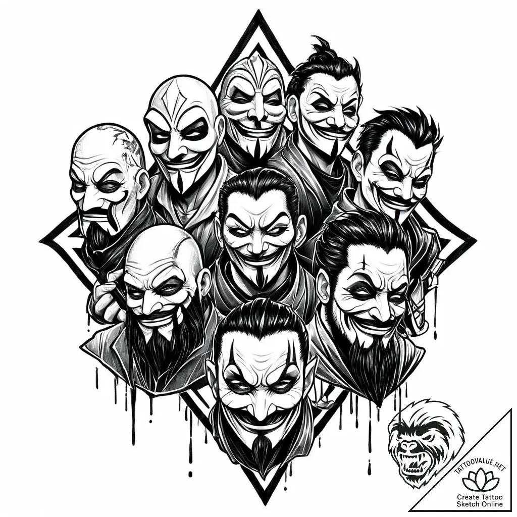 This design is perfect for individuals who embrace their rebellious spirit and appreciate the allure of mystery and the power of the collective. It would be striking on the forearm or calf, allowing the intricate details of each mask to be appreciated, or as a bold statement piece on the back between the shoulder blades, creating a commanding and unforgettable visual narrative.