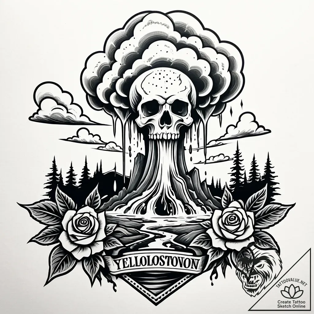 This bold tattoo sketch erupts with raw, primal energy, featuring a skull-shaped geyser spewing forth a torrent of steam and liquid, reminiscent of Yellowstone's dramatic power. Framed by classic Chicano-style roses and a rugged mountain landscape, the design evokes a potent blend of natural force and morbid beauty, executed with thick, graphic linework and a desaturated palette for a vintage tattoo aesthetic.