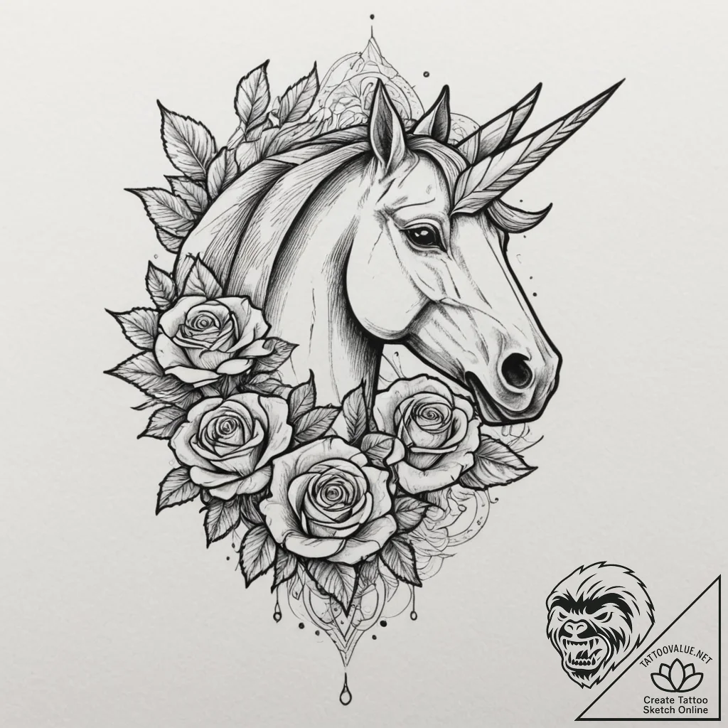 Presenting a exclusive tattoo sketch, prepared based on your request “the origami unicorn from blade runner, tattoo flash sheet design, subtle drop shadow, object casting a light shadow, clean lines, crisp outlines, sharp linework, chicano tattoo style, fine line black and grey, religious iconography, lettering, roses, skulls, aesthetically pleasing, beautiful design, moderately detailed, balanced complexity, clear subject definition, vibrant colors, full color spectrum, bold bright tattoo inks, clear image, sharp focus” at tattoovalue.net.