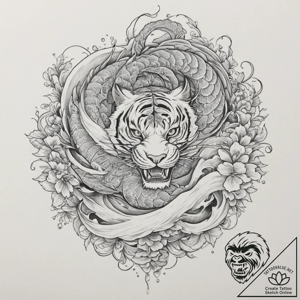 This unusual design inspired by “tiger, tattoo sketch design, on white paper, clean white background, isolated on white, highly detailed, intricate patterns, complex elements, sharp details, dynamic composition, sense of movement, black outline only, pure linework, no shading, unique design, original concept, irezumi japanese tattoo style, traditional japanese motifs (dragon, koi, Hannya, sakura, waves), clean lines, crisp outlines, sharp linework” was created especially for you at tattoovalue.net.