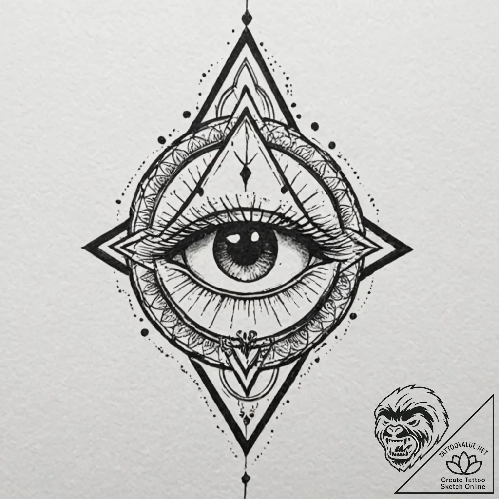 Your request “trash polka style tattoo of the eye of sauron, fiery and menacing, with black ink splashes and elvish script., concept art for tattoo, minimalist approach, simple forms, clean and uncluttered design, black outline only, pure linework, no shading, clear image, sharp focus, geometric tattoo style, sacred geometry patterns, mandalas, abstract shapes, symmetrical, on textured artist paper, craft paper background, detailed cross-hatching shading, pen and ink hatching” has been brought to life in a new sketch at tattoovalue.net.