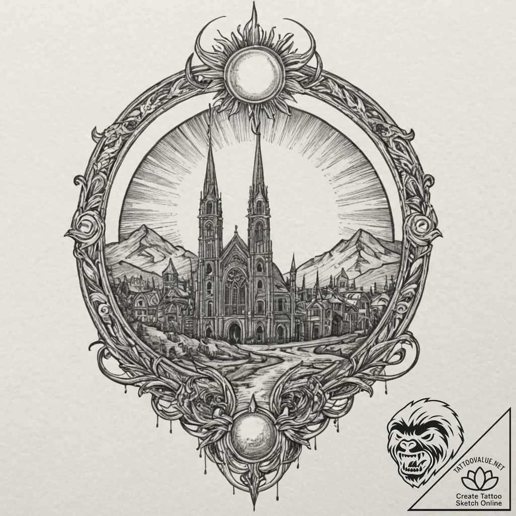 Presenting a exclusive tattoo sketch, prepared based on your request “undercity spire beneath eclipsed sun, tattoo drawing outline, stylized interpretation, graphic style, artistic stylization, dynamic composition, sense of movement, detailed cross-hatching shading, pen and ink hatching, sepia tone sketch, vintage paper look, on a clean white paper, isolated, neo traditional tattoo, illustrative, art nouveau influence, detailed, rich colors, masterpiece, best quality, top-tier” at tattoovalue.net.