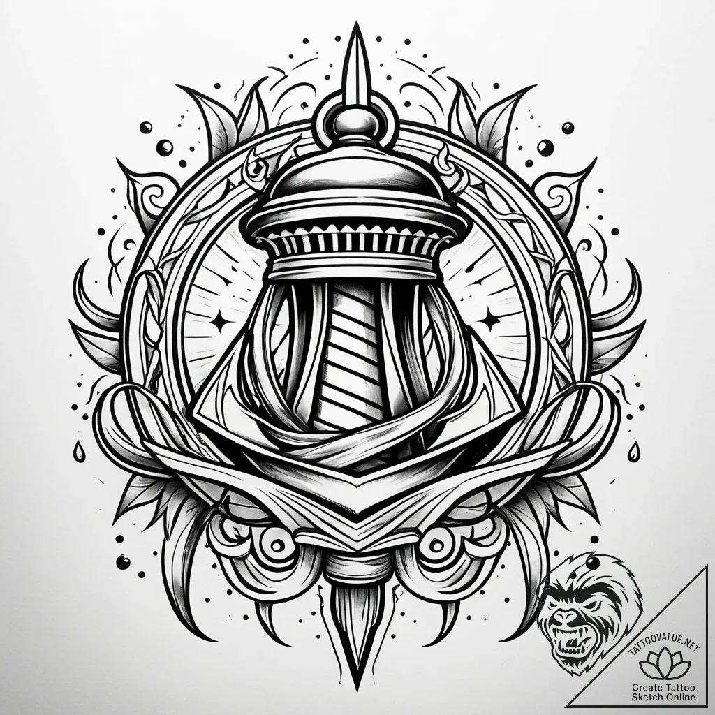 This bold American Traditional sketch features a stylized barber pole, a beacon of transformation, ensnared by flowing ribbons and framed by a celestial halo of leaves and radiating dots. The monochromatic design, rendered with thick, graphic lines and nuanced shading, evokes a sense of timeless artistry, capturing the essence of classic sailor tattoos with a unique, conceptual flair.