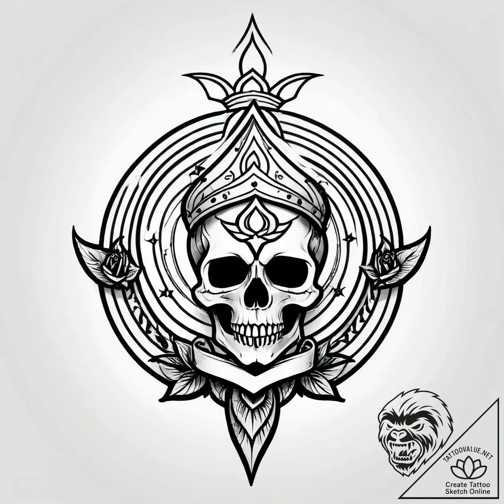 This black and grey sketch presents a striking skull, crowned with intricate, star-kissed regalia, as the epicenter of a radiating vortex of concentric circles. Its bold, heavy linework and smooth gradients evoke the raw power and narrative depth of Chicano tattoo style, tempered by a minimalist approach to simple, clean forms that create an uncluttered, impactful composition.
