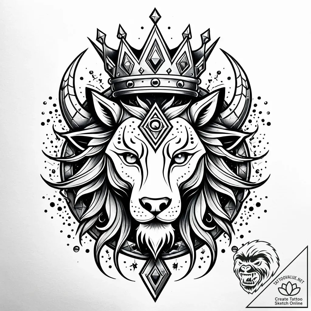 This striking sketch presents a regal lion's head, crowned with a detailed, gem-adorned circlet and framed by sharp, stylized horns reminiscent of a zodiac sigil. The artistic stylization, employing exaggerated forms and dotwork shading, creates a graphic composition that feels both ancient and contemporary, like a myth etched in monochrome.