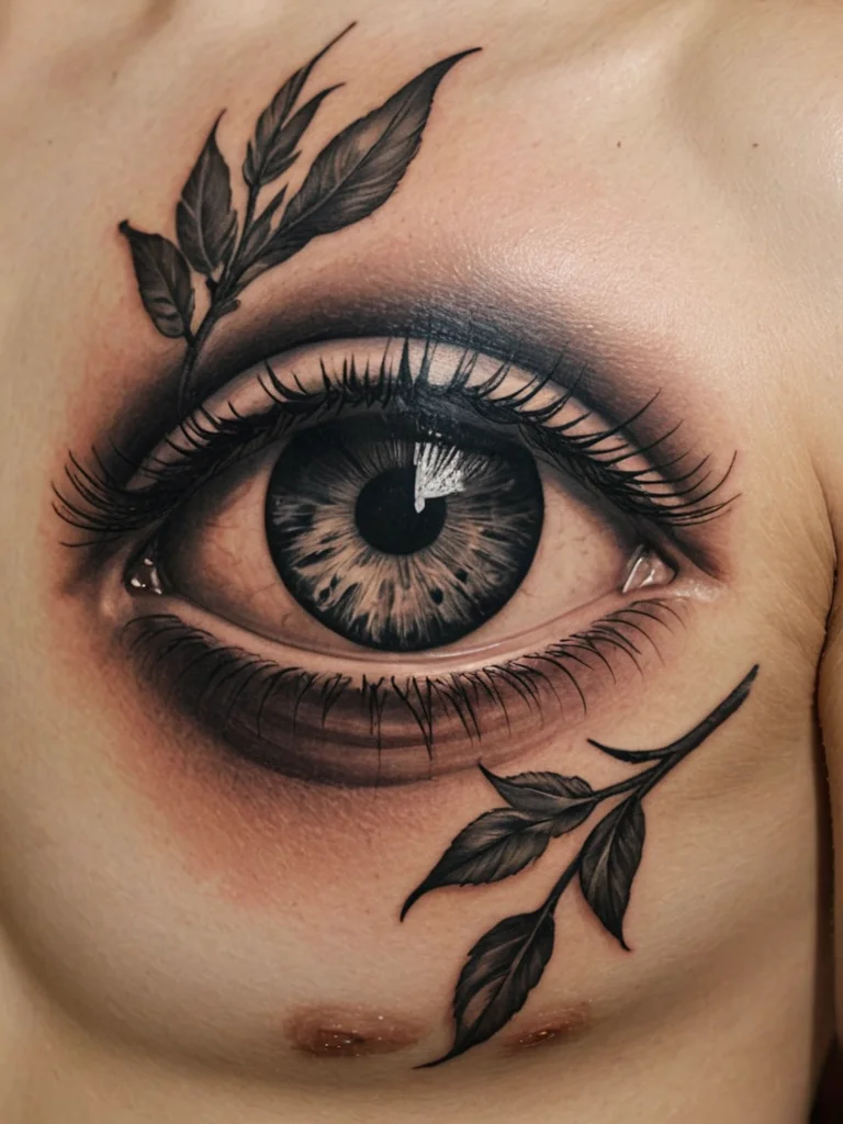 This tattoo is a striking and captivating piece of body art, showcasing a hyperrealistic depiction of a human eye. The focal point is the eye itself, with its mesmerizing blue iris, detailed pupil, and delicate eyelashes. The artist has meticulously rendered the skin texture around the eye, creating a lifelike effect. The addition of green leaves framing the eye adds a touch of nature and symbolism. The composition is dynamic, with the eye appearing to gaze directly at the viewer. The placement on the chest provides a prominent canvas for this impactful design.
