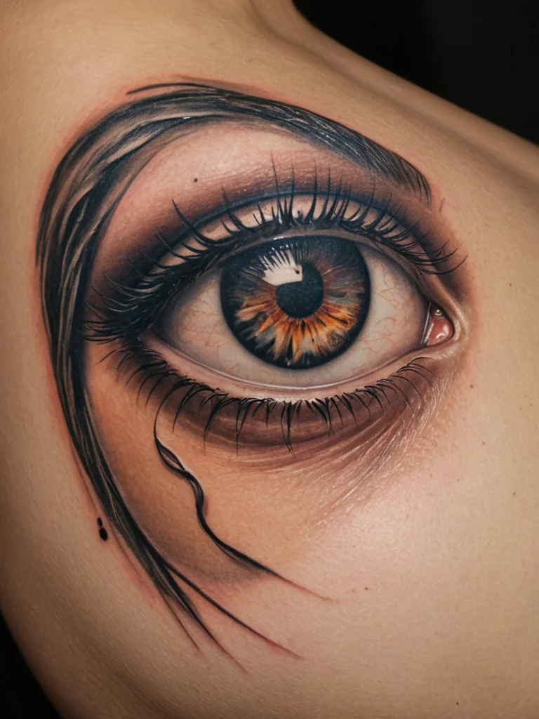 This tattoo is a mesmerizing display of realism, capturing the captivating beauty of a human eye. The focal point is the eye itself, with its striking amber iris, detailed pupil, and delicate eyelashes. The artist has meticulously rendered the skin texture around the eye, creating a lifelike effect. The addition of flowing lines emanating from the eye adds a sense of movement and energy. The composition is dynamic, with the eye appearing to gaze directly at the viewer. The placement on the shoulder provides a natural canvas for this impactful design.