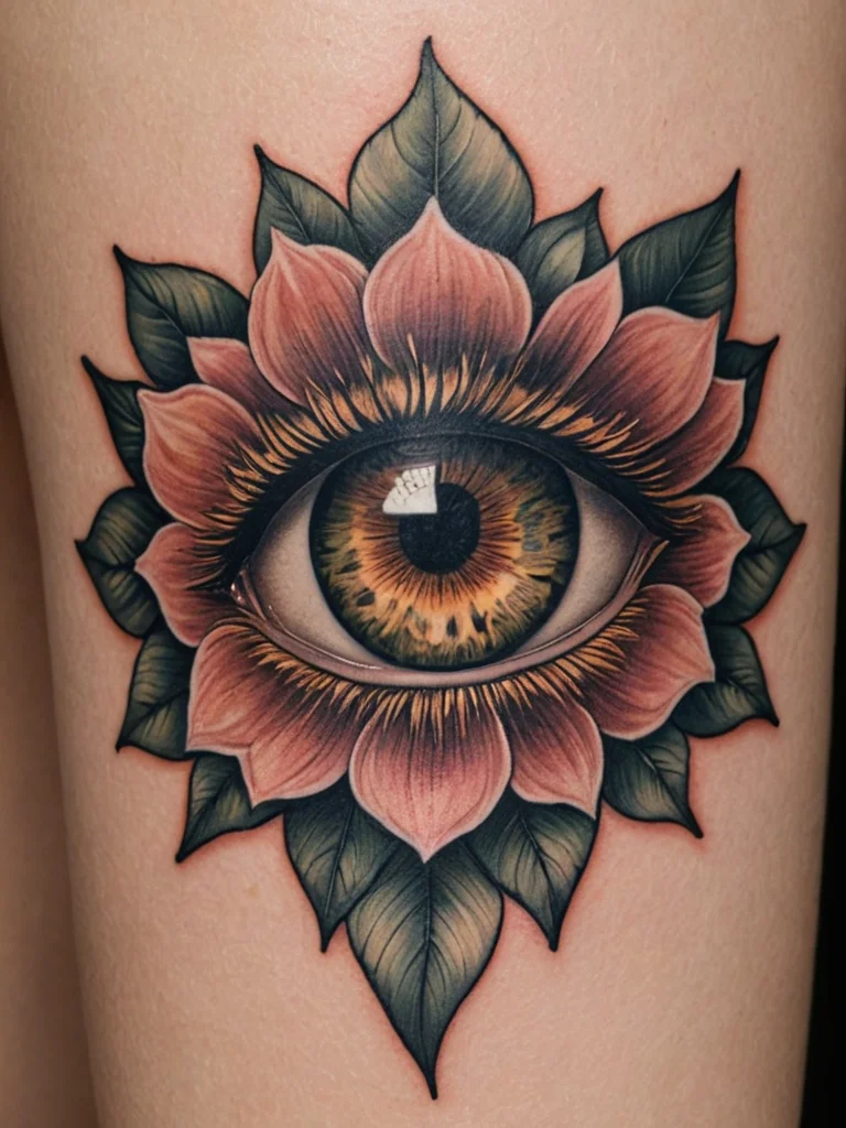 This tattoo is a captivating fusion of floral beauty and mystical symbolism, beautifully rendered on the thigh. The focal point is a vibrant lotus flower, with an all-seeing eye nestled within its center. The artist employs a rich color palette, with shades of pink, green, and gold creating a visually stunning effect. The petals of the lotus are delicately shaded, giving them a lifelike appearance. The eye is rendered with remarkable detail, capturing the nuances of the iris and pupil. The placement on the thigh allows for a large-scale design that showcases the intricate details.