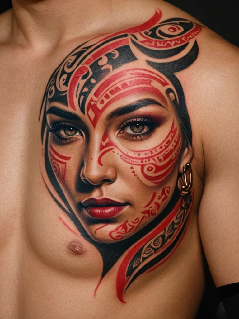 This tattoo is a captivating fusion of realism and tribal art, creating a visually stunning and culturally rich design. The focal point is the woman’s face, rendered with remarkable detail and expressiveness. The artist has masterfully captured her features, creating a lifelike portrait. Surrounding the portrait are bold tribal patterns, adding a sense of dynamism and energy. The color palette is limited to black and red, providing a striking contrast that emphasizes the design’s intricate details. Shading is used to create depth and dimension, particularly within the tribal motifs. The placement on the chest and shoulder is significant, as these areas are often associated with strength and courage.
