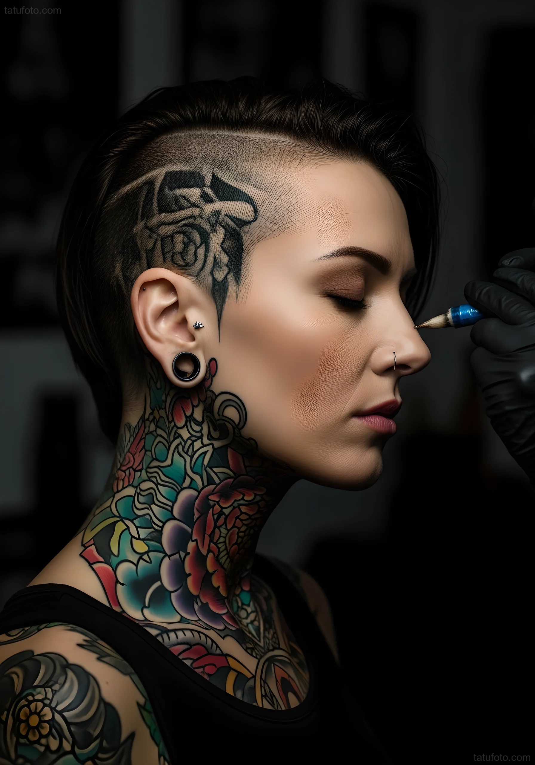 This striking portrait captures a woman in the process of receiving new tattoo art, offering a fascinating juxtaposition of styles. Her neck is adorned with a lavish, colorful Neo-Traditional tattoo featuring prominent floral elements, likely peonies or chrysanthemums, rendered with bold outlines and rich, saturated hues. This piece flows gracefully around her neck, making a vibrant statement. In stark contrast, the shaved side of her head showcases an intricate blackwork tattoo, dominated by a stylized rose motif intertwined with geometric and abstract patterns. The blackwork piece is characterized by its sharp lines and negative space, creating a dynamic visual effect that complements the vibrant neck piece without clashing. The composition demonstrates how distinct tattoo styles can coexist harmoniously on a single canvas, each making its unique artistic contribution. The focal points are clearly the contrasting styles and the meticulous detail in both the colorful and monochromatic ink.