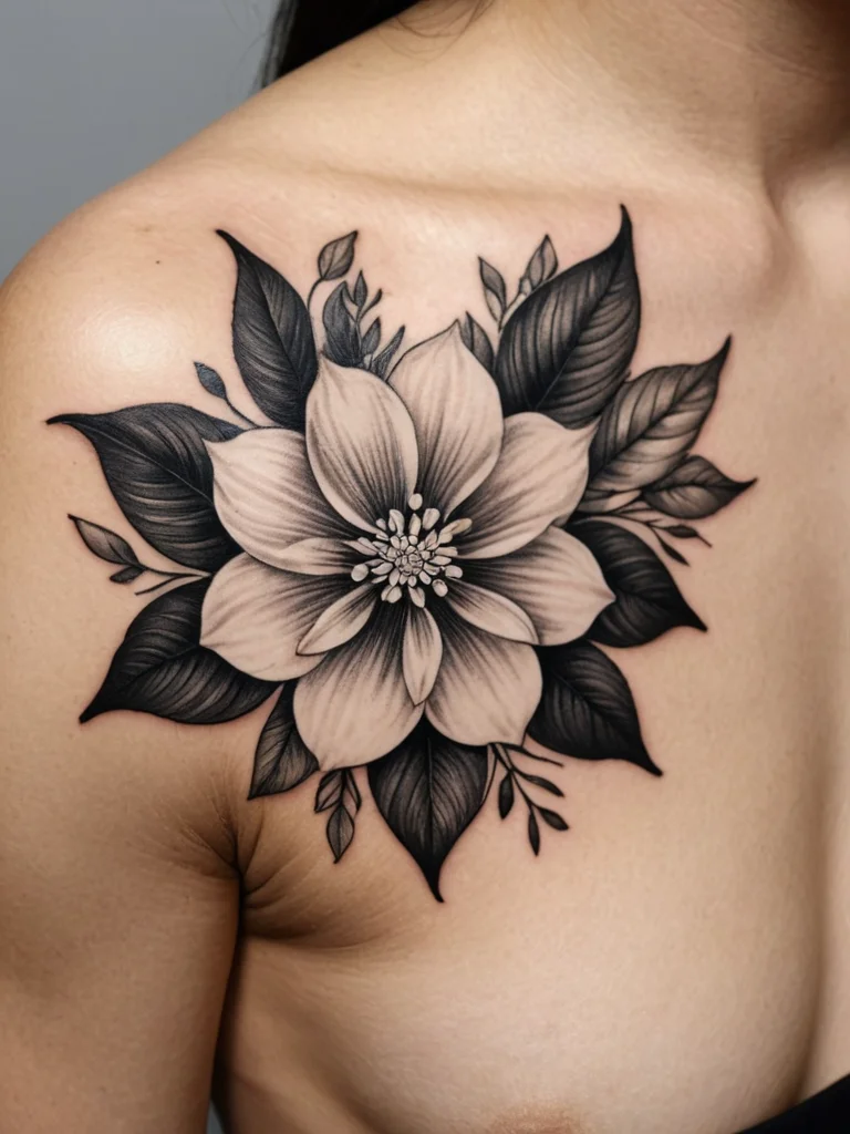 This tattoo is a stunning depiction of a magnolia flower, gracefully positioned on the upper chest. The focal point is the flower itself, with its large, delicate petals and lush green leaves. The artist employs a range of shading techniques to create depth and dimension, capturing the subtle nuances of the petals and leaves. The composition is balanced, with the flower positioned centrally on the chest. The placement accentuates the natural curves of the body and creates a visually appealing design.