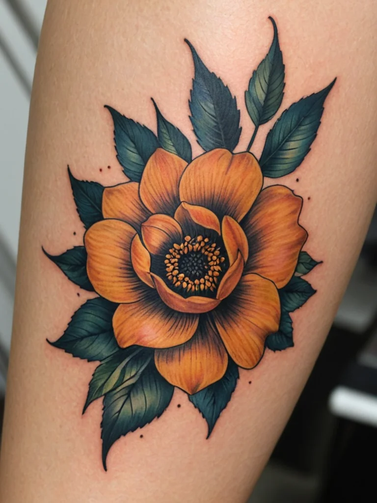 This tattoo is a captivating example of Neo-traditional artistry, showcasing a beautifully rendered anemone flower. The focal point is the flower itself, with its vibrant golden petals and contrasting teal leaves. The artist has used bold black outlines to define the shapes and create a graphic quality. The composition is balanced and symmetrical, with the flower taking center stage. The shading is expertly applied to create depth and dimension, particularly in the petals. The placement on the thigh allows for a larger, more detailed design.