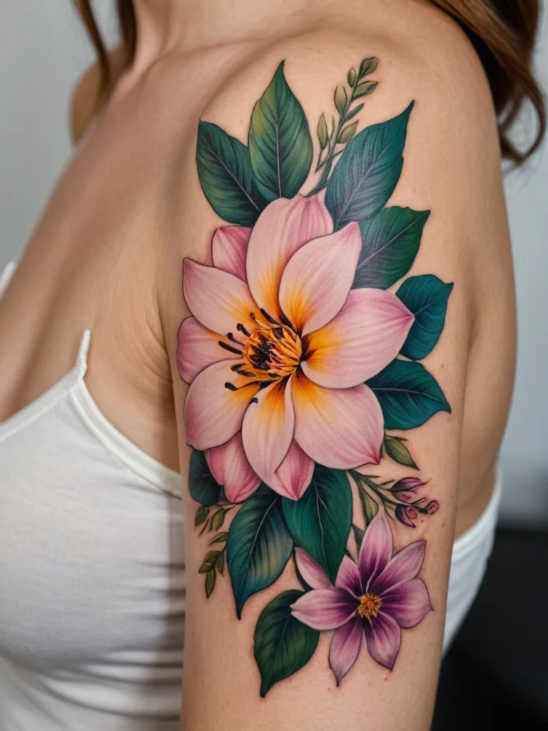 This tattoo is a breathtaking display of floral artistry, beautifully wrapping around the shoulder. The focal point is a cluster of magnolia blossoms, rendered in delicate shades of pink and peach. The artist has skillfully captured the intricate details of the petals and the lush green foliage. The addition of smaller purple flowers adds a touch of contrast and visual interest. The composition is dynamic, with the flowers cascading downwards and around the shoulder. The placement allows the design to flow naturally with the body’s contours.