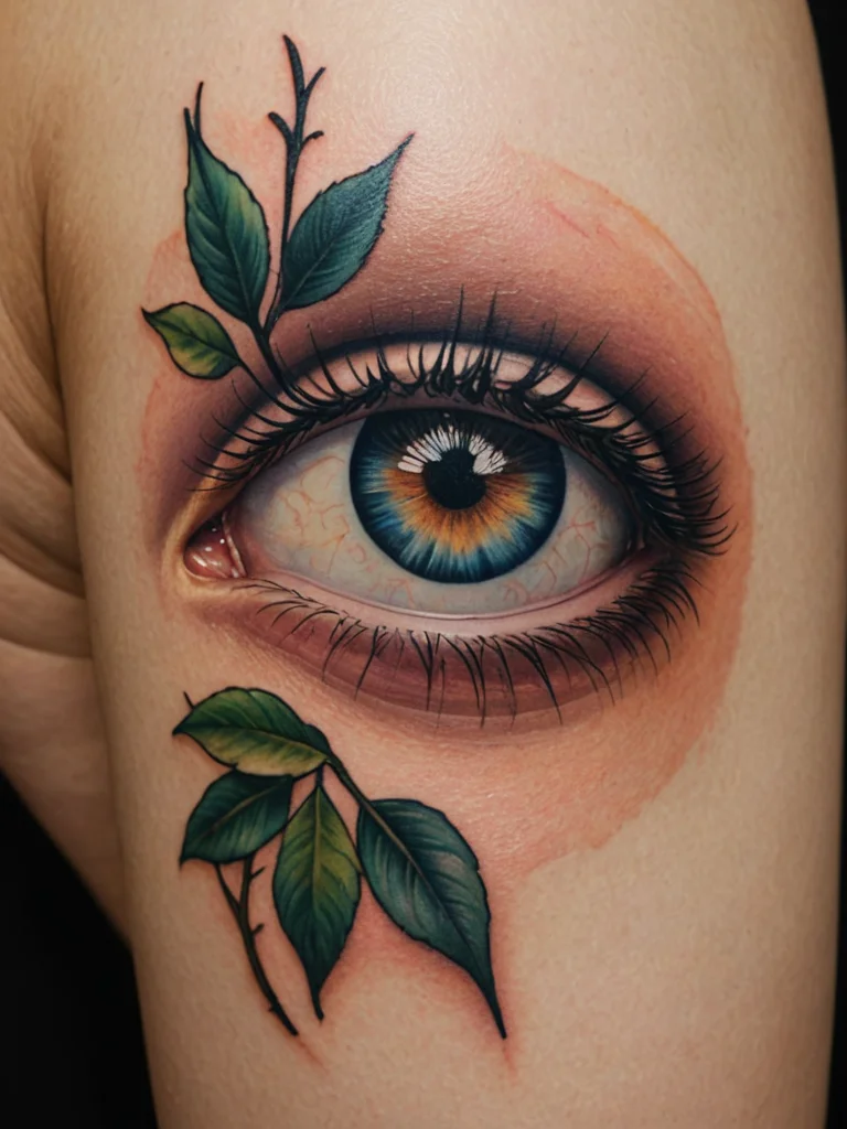 This tattoo is a masterclass in realism, capturing the intricate details of a human eye with astonishing accuracy. The focal point is the eye itself, with its vibrant blue iris, detailed pupil, and delicate eyelashes. The artist has meticulously rendered the skin texture around the eye, creating a lifelike effect. The addition of green leaves framing the eye adds a touch of nature and symbolism. The composition is dynamic, with the eye appearing to gaze directly at the viewer. The placement on the upper arm provides a canvas large enough to showcase the intricate details of the design.