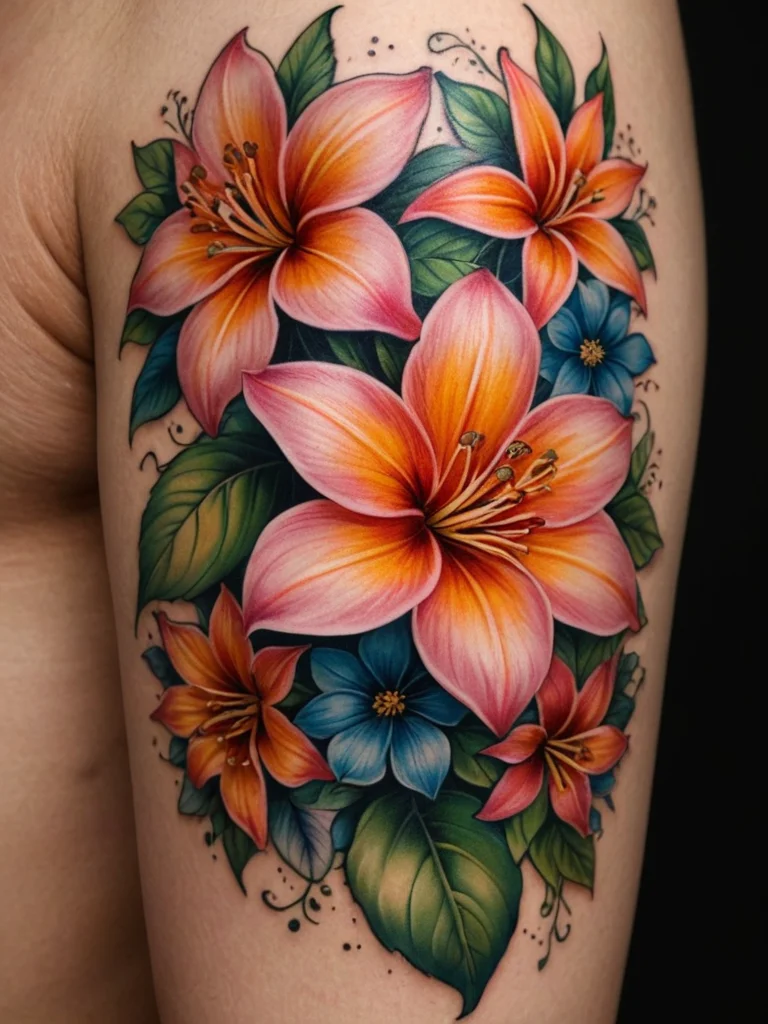 This tattoo is a vibrant celebration of floral beauty, showcasing a lush bouquet of lilies in full bloom. The design is characterized by its rich color palette, featuring warm oranges, cool blues, and lush greens. The composition is dynamic, with the flowers arranged in a cascading pattern that follows the contours of the upper arm. The focal point is the central lily, which is rendered in exquisite detail, with delicate petals and a prominent stamen. The artist has skillfully used shading to create a sense of depth and dimension, making the flowers appear almost three-dimensional. The placement on the upper arm allows for a generous display of the floral design.