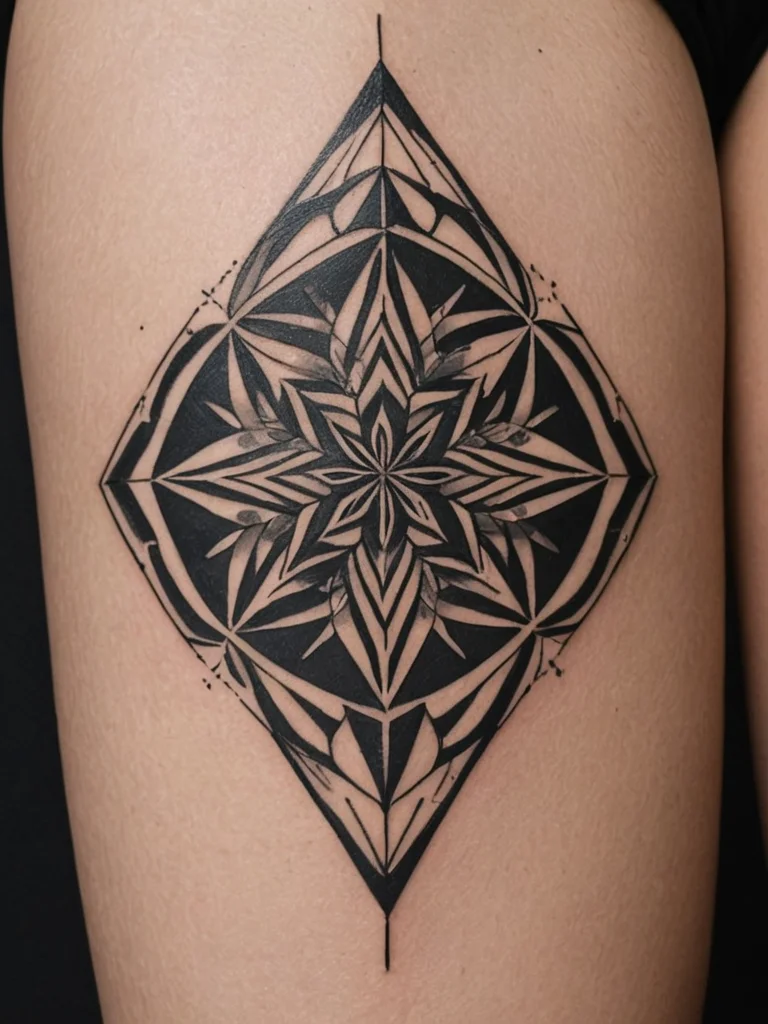 Geometric tattoos often represent order, balance, and the interconnectedness of all things. The diamond shape itself can symbolize strength, clarity, and transformation. In some cultures, geometric patterns are believed to hold sacred meaning, representing the underlying structure of the universe. The placement on the thigh can be seen as a grounding element, connecting the design to the physical body.