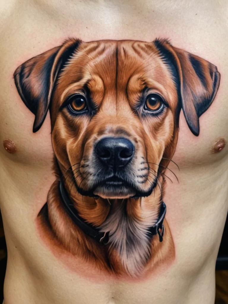 Hyperrealistic portrait tattoo of a brown dog on the chest, showcasing detailed fur texture and expressive eyes. A heartwarming and personalized tattoo.